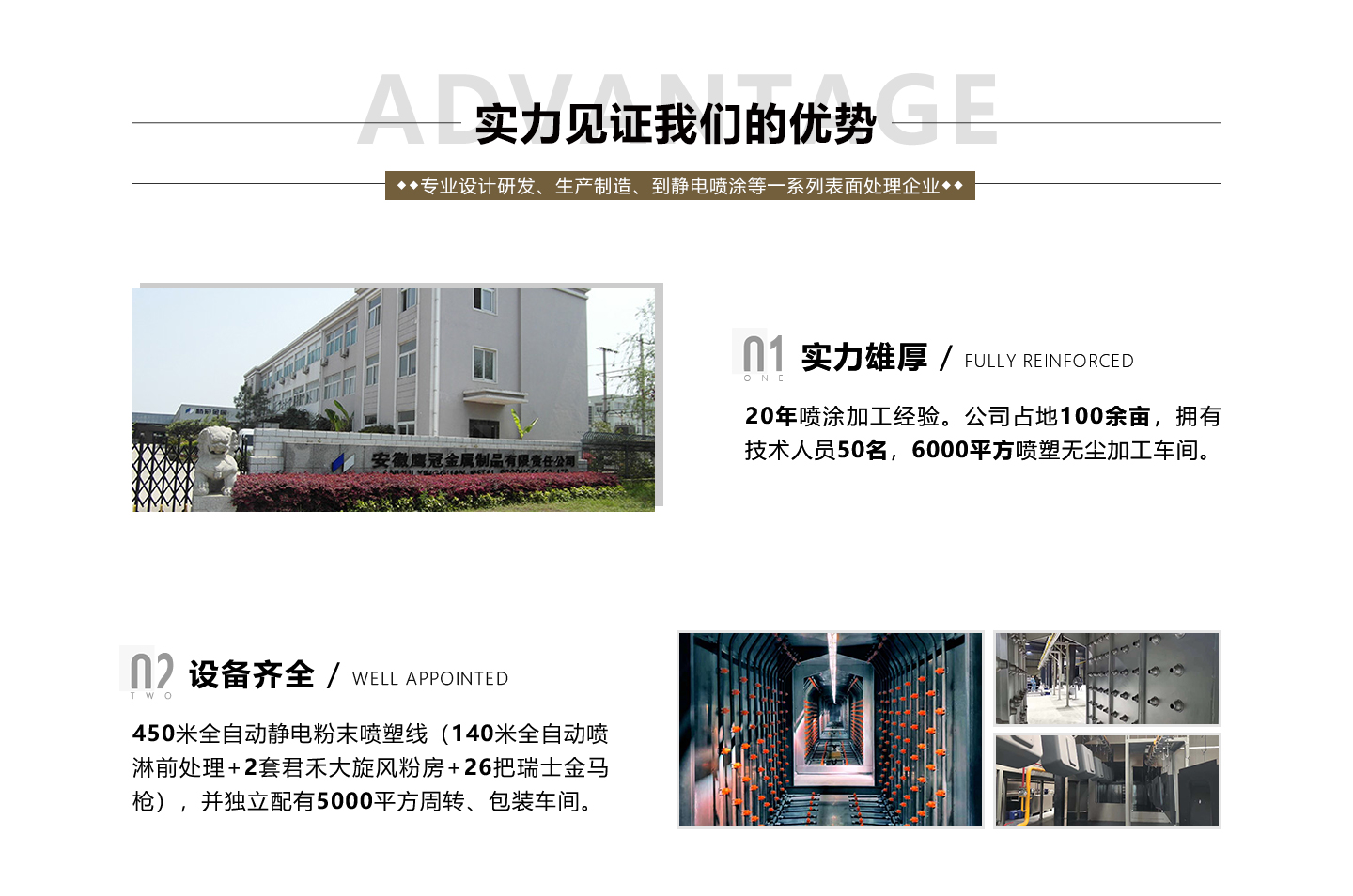安徽鷹冠金屬制品有限責(zé)任公司座落于----安徽合肥新城開(kāi)發(fā)區(qū),占地100畝,總面積20000平方米,是國(guó)內(nèi)規(guī)模較大的彩鋼護(hù)欄型材研發(fā)生產(chǎn)基地之一。公司于一九九八年建廠(chǎng)至今,涉足大型零售商業(yè)、房地產(chǎn)行業(yè)近20年,已經(jīng)形成了從設(shè)計(jì)研發(fā)、生產(chǎn)制造、到靜電噴涂等一系列表面處理的專(zhuān)業(yè)團(tuán)隊(duì)。公司“新冠”彩鋼系列產(chǎn)品基材采用無(wú)縫鍍鋅鋼,雙面高溫?zé)徨冧\處理,表面處理使用阿克蘇諾貝爾公司的富鋅環(huán)氧涂層,聚酯彩色粉末涂層,經(jīng)二十多道防腐經(jīng)典噴涂工藝。產(chǎn)品具有出眾的防銹蝕、耐鹽霧、耐油煙、耐濕熱、耐刮擦的優(yōu)良特性?,F(xiàn)公司擁有150名員工,其中技術(shù)人員20名,技工30名。2006年建立新冠彩鋼設(shè)計(jì)研發(fā)檢測(cè)中心,由多名...